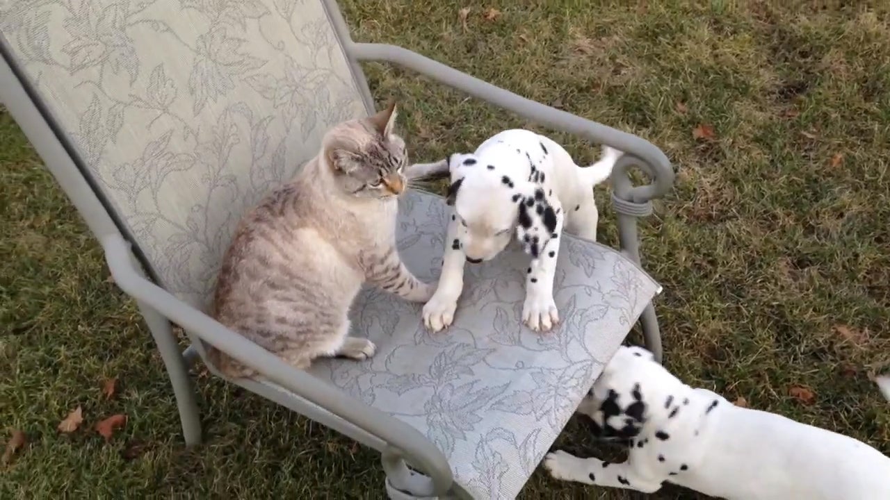 Zwei süße Dalmatiner sind sichtlich begeistert von einer kleinen Katze.