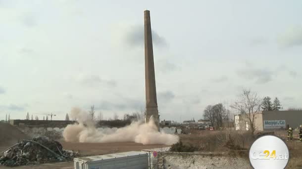 Heute Mittag wurde in Schwechat der 48 Meter hohe Rauchfang der ehemaligen Brauerei gesprengt.