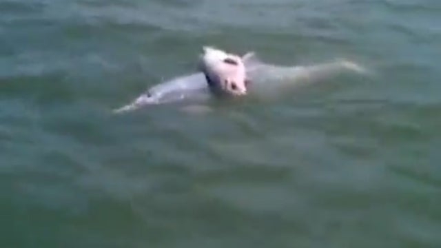 Ein Delphin trägt sein totes Junges auf dem Rücken auf die offene See hinaus. Dieses Verhalten würde schon öfters bei Delphinen beobachtet. Tierforscher vermuten dahinter eine Art Trauerritual.