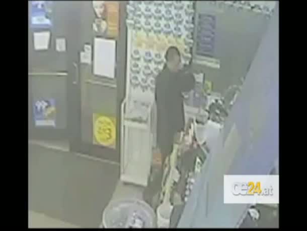 Auch ein Tankstellen-Überfall will gelernt sein oder sollte zumindest geprobt werden. Sonst könnte es einem wie diesem Mann gehen, der hier vergeblich versucht, seine Sturmhaube übers Gesicht zu ziehen und sich dabei auch noch filmen lässt.
