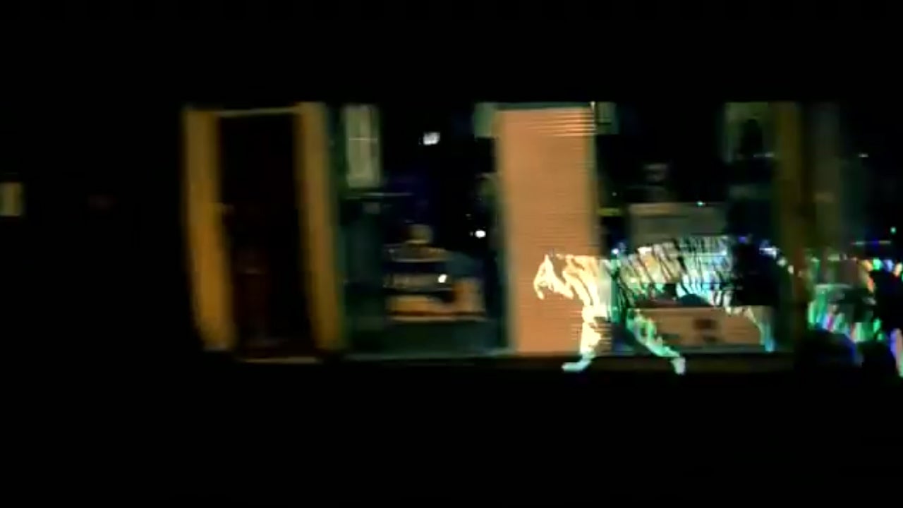Eine faszinierende Projektion eines durch Paris laufenden 3D-Tigers.