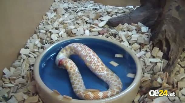 In einer englischen Tierhandlung ist sich diese "Anbino Western Hognose" - Schlange selber auf. Die erschreckenden Bilder wurden von einem Amateurfilmer aufgenommen.