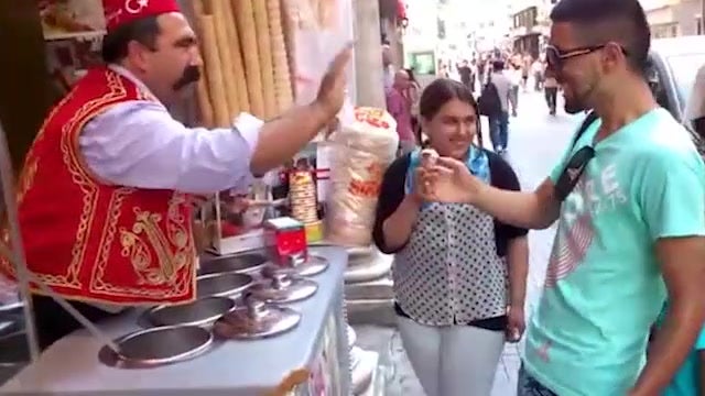 Dieser türkische Eisverkäufer bietet eine besondere Showeinlage. Da wartet man auch gerne ein wenig länger auf sein Eis.