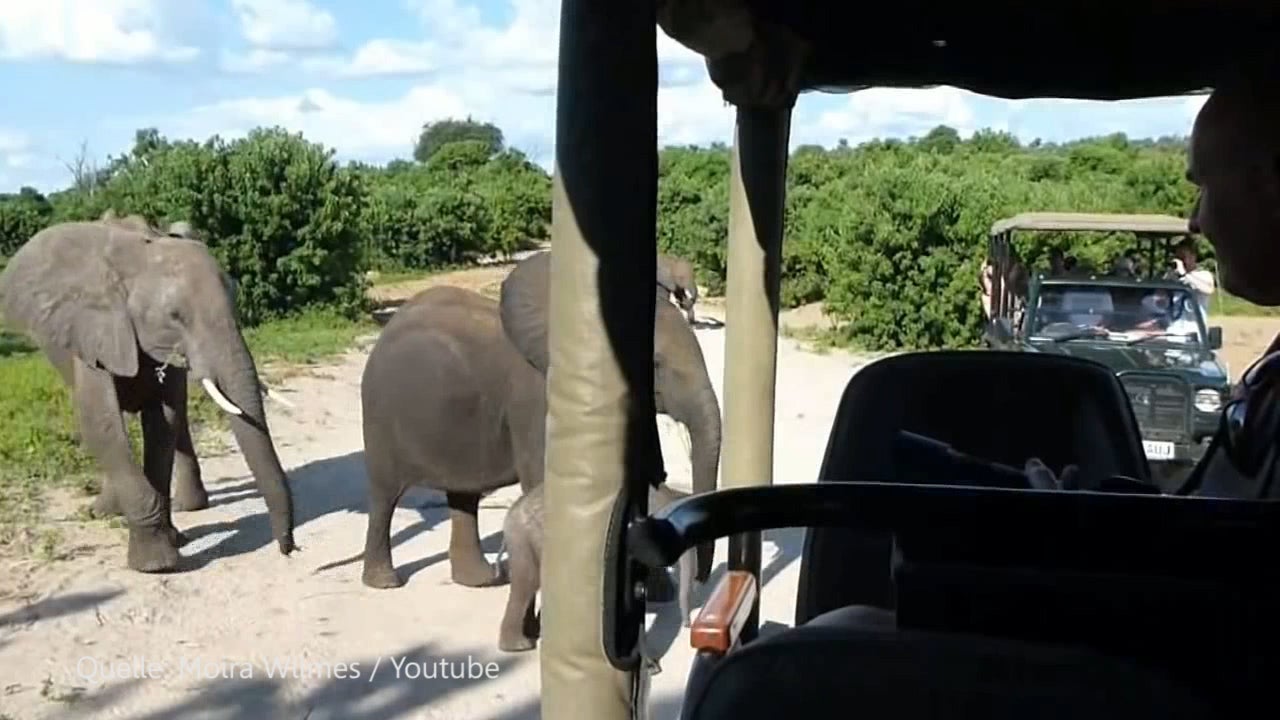 Bei dieser Safari nähern sich die Elefanten gefährlich nah den Fahrzeugen.