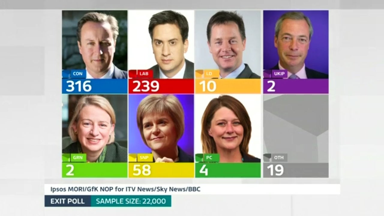 Camerons Konservative gewinnen mit klarem Vorsprung vor Milibands Labour Partei.