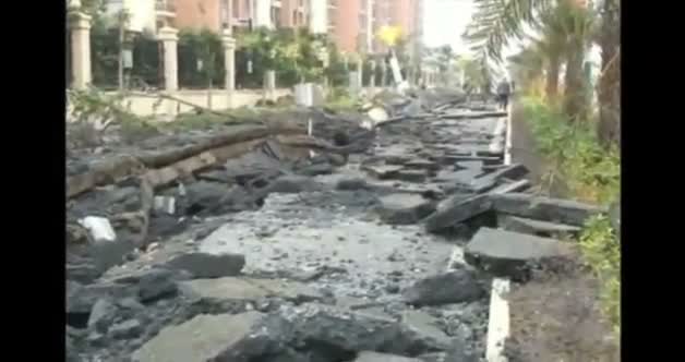 Bilder einer Überwachungskamera zeigen, wie ein kompletter Straßenzug nach einer heftigen Explosion komplett aufreißt.
