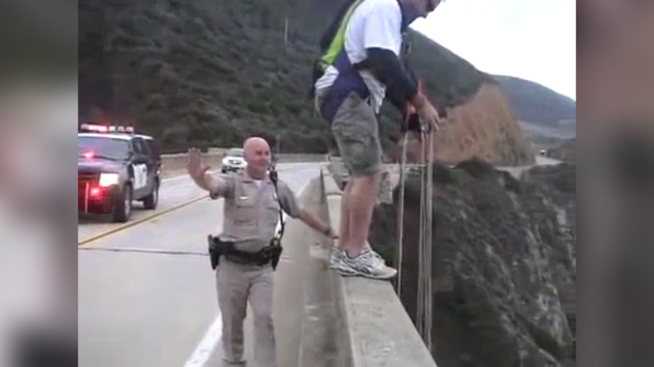 Polizist versucht ihn zu stoppen, doch der Fallschirmspringer stürzt sich unbeeindruckt von der Brücke