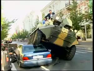 Strafzettel verteilen kann jeder, dieser Mann greift lieber gleich zu schwerem Gerät: Der Bürgermeister der litauischen Hauptstadt Vilnius hat für einen Film mit einem gepanzerten Fahrzeug ein falsch geparktes Auto zerquetscht.