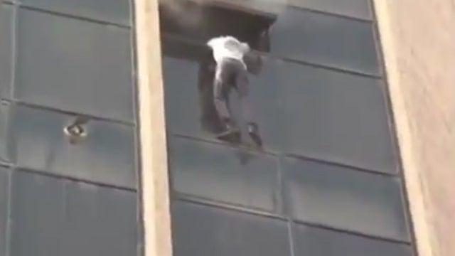 Tragische Bilder entstanden am Mittwoch in Pakistan. In einem Gebäude einer Versicherungsgesellschaft brach ein Feuer aus, ein junger Mann kletterte daraufhin aus einem Fenster um sich vor den Flammen zu schützen. Er hängt an der äußeren Fassade, mit den Händen klammert er sich an der Fensterkante fest. Nach einiger Zeit verlassen den Mann aber die Kräfte und er stürzt aus dem zehnten Stock in die Tiefe.