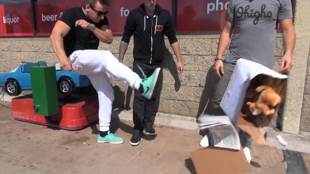 In diesem Video veräppelt ein Komiker Fremde. In einem Karton hat er drei Plüschkätzchen und einen Lautsprecher, der das Miauen von Katzenbabys nachahmt. Genervt kickt er die Box herum. Die Reaktion der Passanten ist einfach nur zum Lachen!