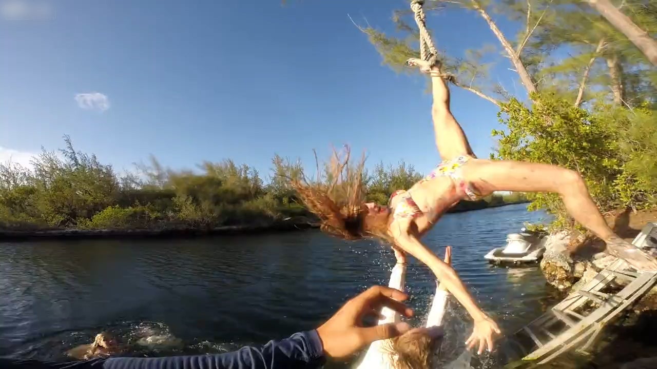 Eine junge Dame schwingt mit einem Seil und bleibt plötzlich hängen.