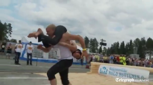 Die alljährige WM im Frauentragen lockte wieder Teilnehmer aus aller Welt auf einen 250 Meter langen, teuflisch schweren Parcours. Rund eine Minute hängen die Frauen verkehrt an den Köpfen ihrer Männer.