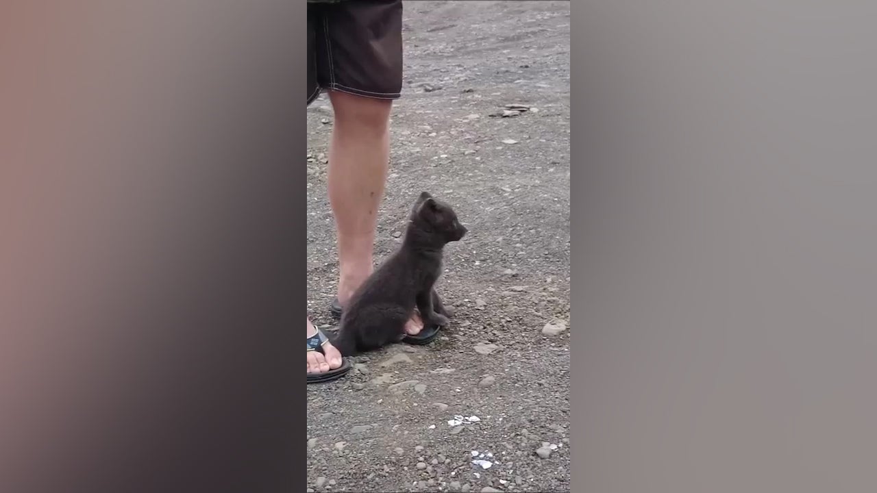 Ein Polarfuchs schwirrt um die Füße eines Mannes, kann ihn wegen seiner Größe aber nicht beißen.