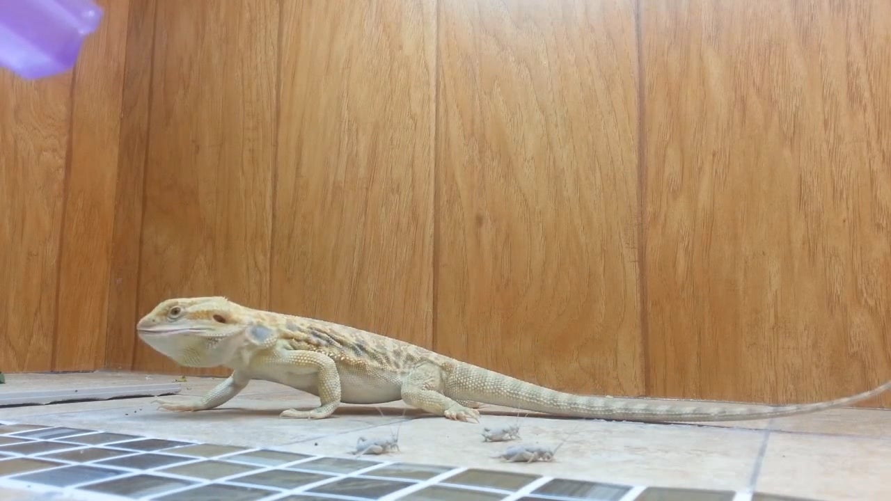 Dieser hungrige Bartagam bekommt endlich seine Heuschrecken zum Fressen.