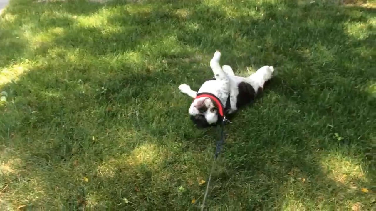 Diese französische Bulldogge genießt es sichtlich auf der Wiese herumgezogen zu werden.
