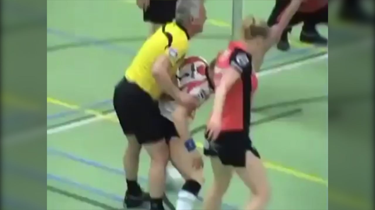 In diesem Video stürzt ein Schiedsrichter auf eine Spielerin. Oder war es doch Absicht?