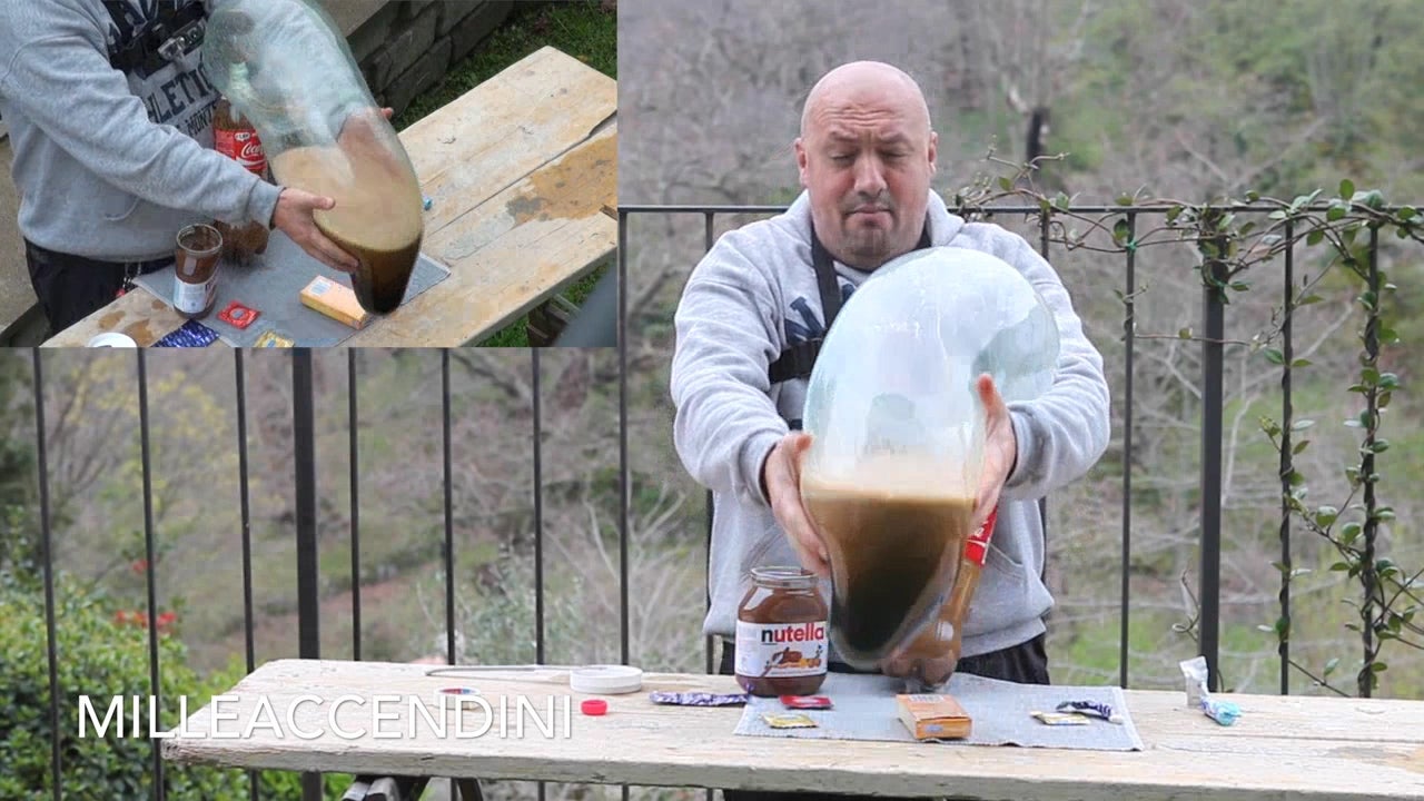 Ein verrückter Italiener wagt das Experiment: mit einer Flasche Cola, Nutella, Mentos und einem Kondom plant er eine Explosion zu erzeugen. Und das gelingt ihm ...