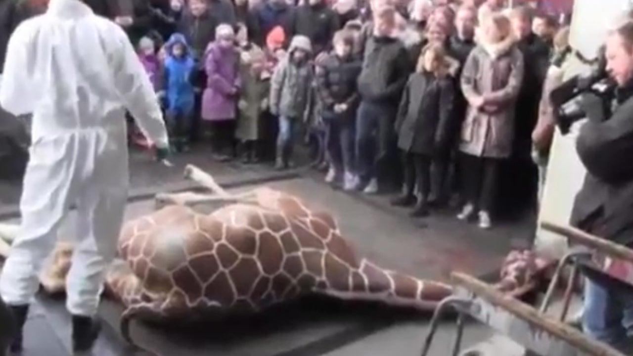 Die Giraffe Marius ist mit einem Bolzenschuss in Anwesenheit der Zoobesucher in Kopenhagen getötet worden. Ihr Fleisch wird anschliessend an die Raubtiere des Zoos verfüttert - zahlreiche Kinder sehen dabei zu. Dass eine gesunde Giraffe sterben muss, ist für viele unverständlich.