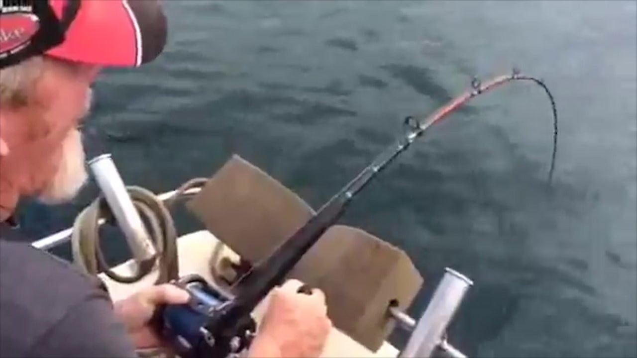 Als der Angler den Fisch rausziehen will, schnappt plötzlich ein Hai danach.
