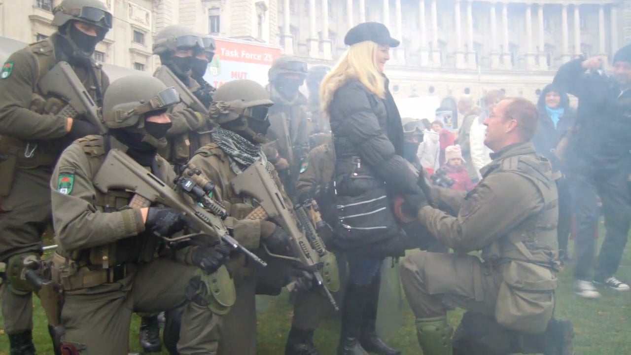 Ein Soldat macht seiner Freundin am Nationalfeiertag einen Antrag.