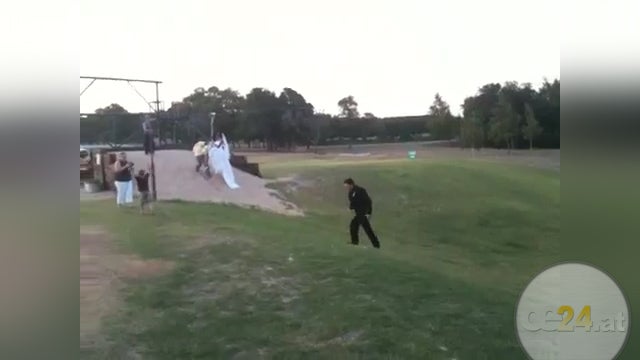 Braut und Bräutigam haben sich für ihren schönsten Tag etwas ganz besonders originelles einfallen alssen und wollten ümit einer Zip-Line zur Zeremonie "einschweben". Nur hatte es der Bräutigam etwas zu eilig, und rammte seine Braut. Nicht sehr elegant!