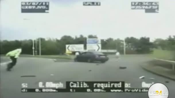 Ein Polizeiauto blockiert eine Strasse in der Grafschaft Surrey im Südwestern von London, um ein gestohlenes Fahrzeug aufzuhalten. Der gerade im Aussteigen begriffene Beamter wird ergriffen und durch die Luft geschleudert.