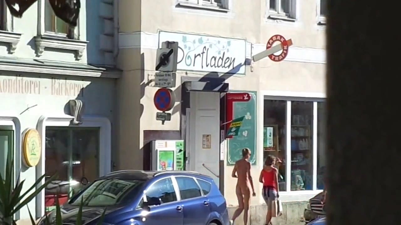 Nur mit Turnschuhen bekleidet spaziert eine hübsche Blondine in eine Bäckerei.