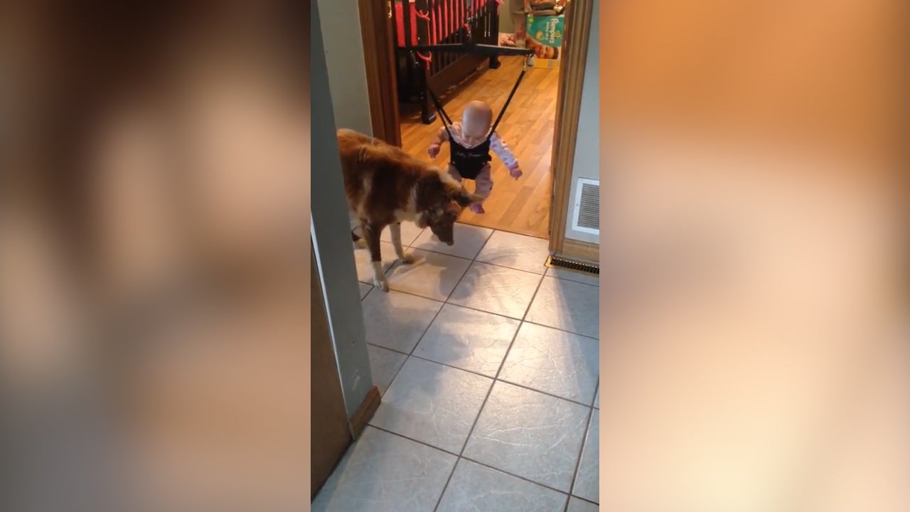 Smarter Hund zeigt Baby, wie man die Laufhilfe zum Springen benützt.