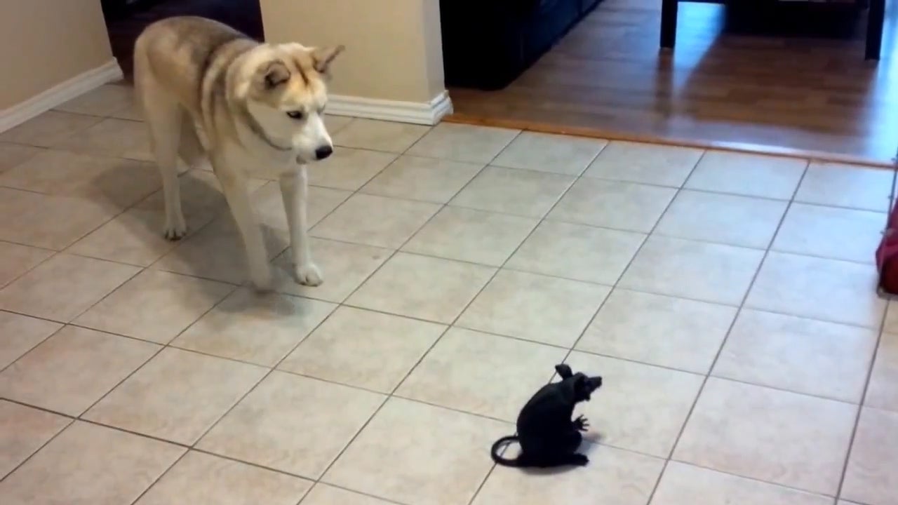 Ängstlicher Hund weiss nicht, was er von böser Fake-Ratte halten soll.