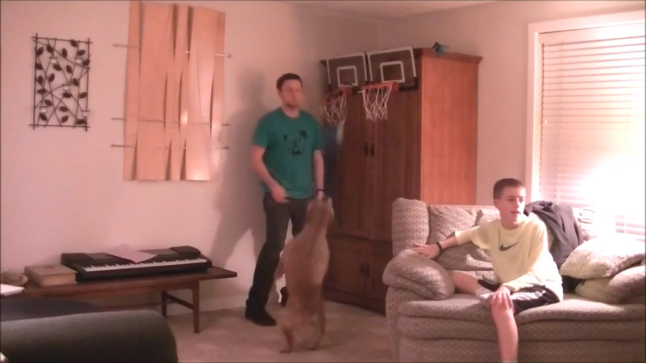 Eine Bulldogge wird von ihrem Besitzer ins Basketballspiel integriert.