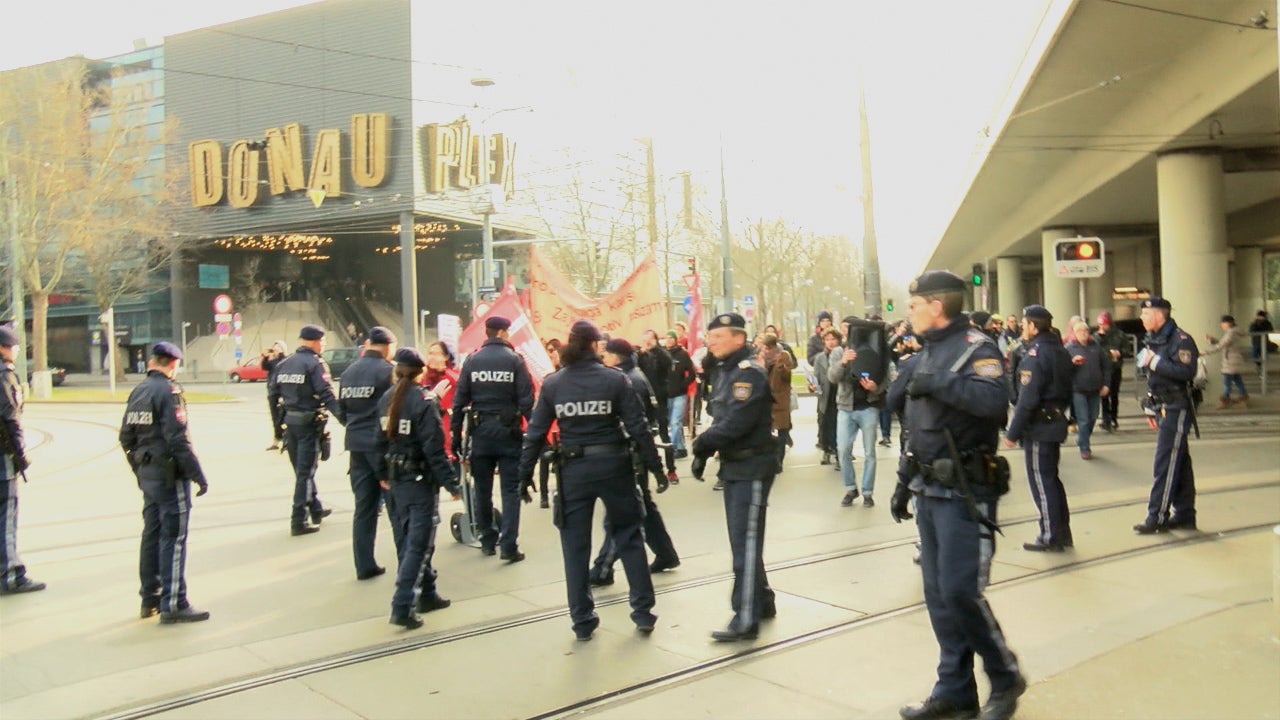 Rechts trifft auf links: "Die Identitären" und die "Offensive gegen Rechts" vor dem Donauzentrum im 22. Bezirk.