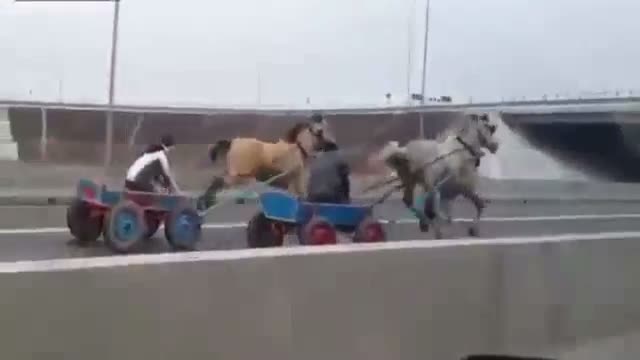 Auf Rumäniens Straßen laufen die Uhren offenbar anders und so galoppieren Pferde auf einer stark befahrenen Autobahn um die Wette.