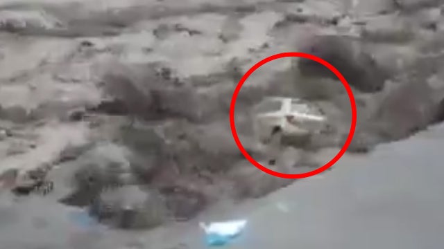 Zwei Wochen nach den Überschwemmungen und Erdrutschen in Indien rechnen die Behörden mit bis zu 10.000 Toten. Dieses Bildmaterial zeigt wie eine Straße einfach weggespült wird. Man kann auch ein Auto in den Fluten erkennen.