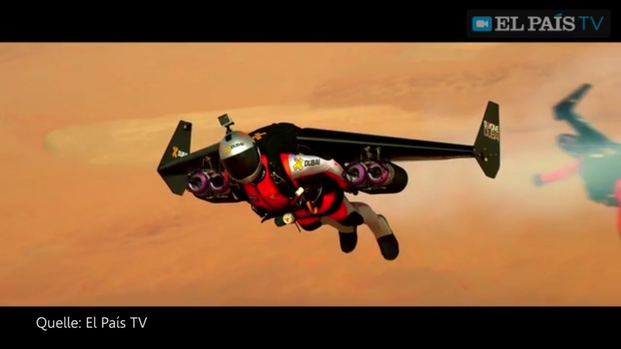 Zwei Männern begeistern zwischen den Wolkenkratzern von Dubai mit fliegenden Rucksäcken.