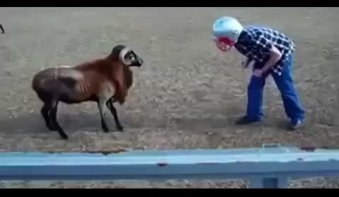 Hier treffen wohl zwei Sturköpfe aufeinander. Doch wer ist stärker? Dieser junge Mann möchte es wissen und legt sich mit einem Schafsbock an. Helm gegen Hörner - ein ziemlich ungleicher Kampf. Sieger ist eindeutig der Schafsbock.