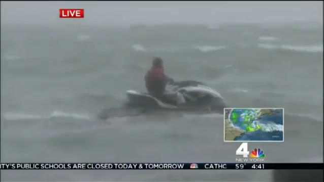 Kurz bevor der Monster-Hurrikan "Sandy" New York mit voller Wucht treffen sollte, sorgte ein Irrer im Hafen des "Big Apple" für Furore. Der Mann war trotz Sturmwarnung inmitten der hohen Wellen mit einem Jetski unterwegs.