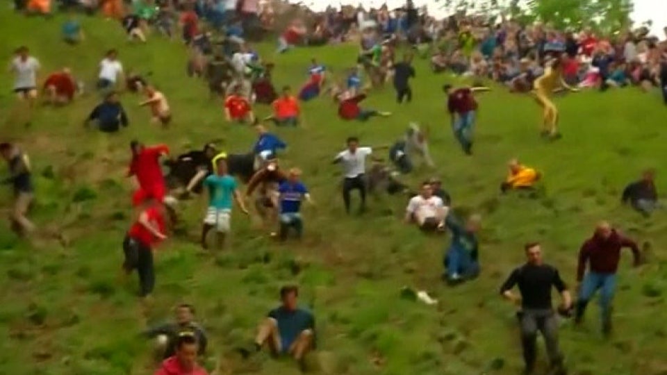 Beim jährlichen Cheese Rolling in Gloucestershire jagen tausende waghalsige Draufgänger ein Käserad einen steilen Hügel hinab.