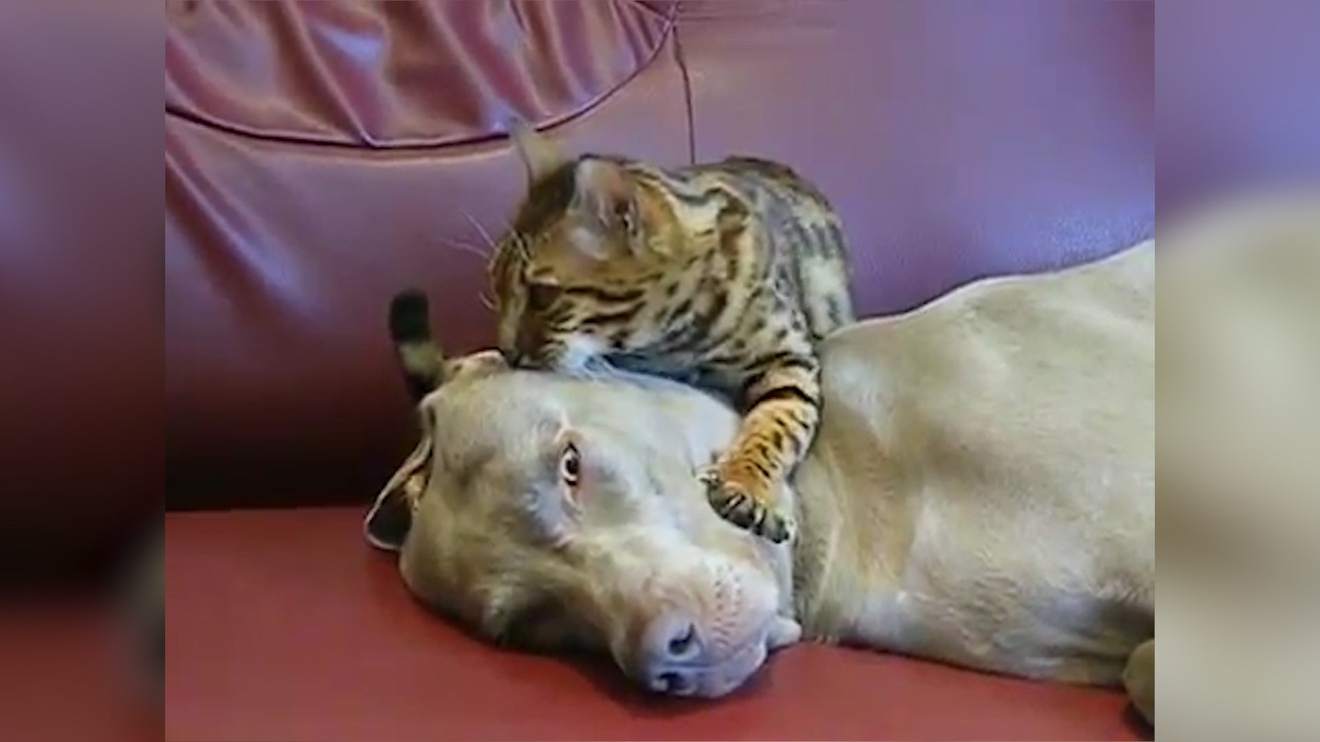 Der entspannte Hund lässt sich von der Katze eine Gesichtsmassage geben.