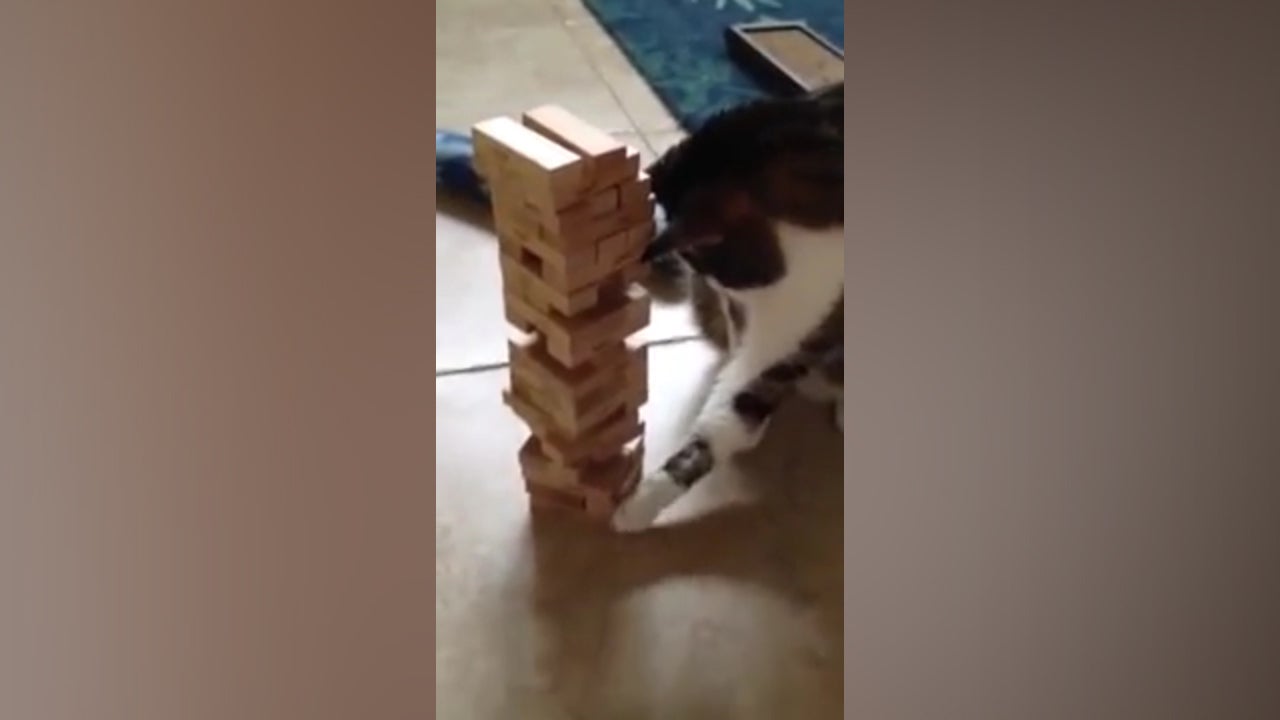 Diese Katze ist überraschenderweise ziemlich gut im Jenga-spielen.