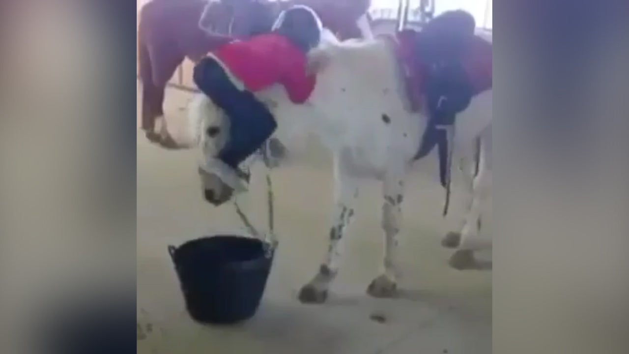 Auch so kann man auf ein Pferd aufsteigen. Dieses Kind zeigt es vor.