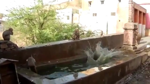 Auf diesem Amateurvideo hielt ein Filmer fest, wie sich eine Schar kleiner Äffchen beim Sonnentempel im indischen Jaipur um eine Art Brunnen tummelten und sich teils mit spektakulären Sprüngen ins kühle Nass stürzten.