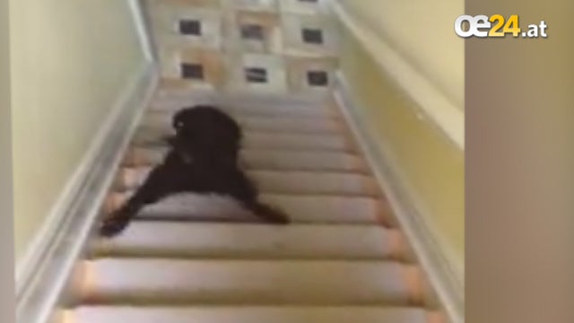 Dieser Welpe hat eine sehr eigene Art Treppen zu überwinden. Er legt sich auf den Bauch und gleitet einfach hinab, was ihm sichtlich Spaß macht.