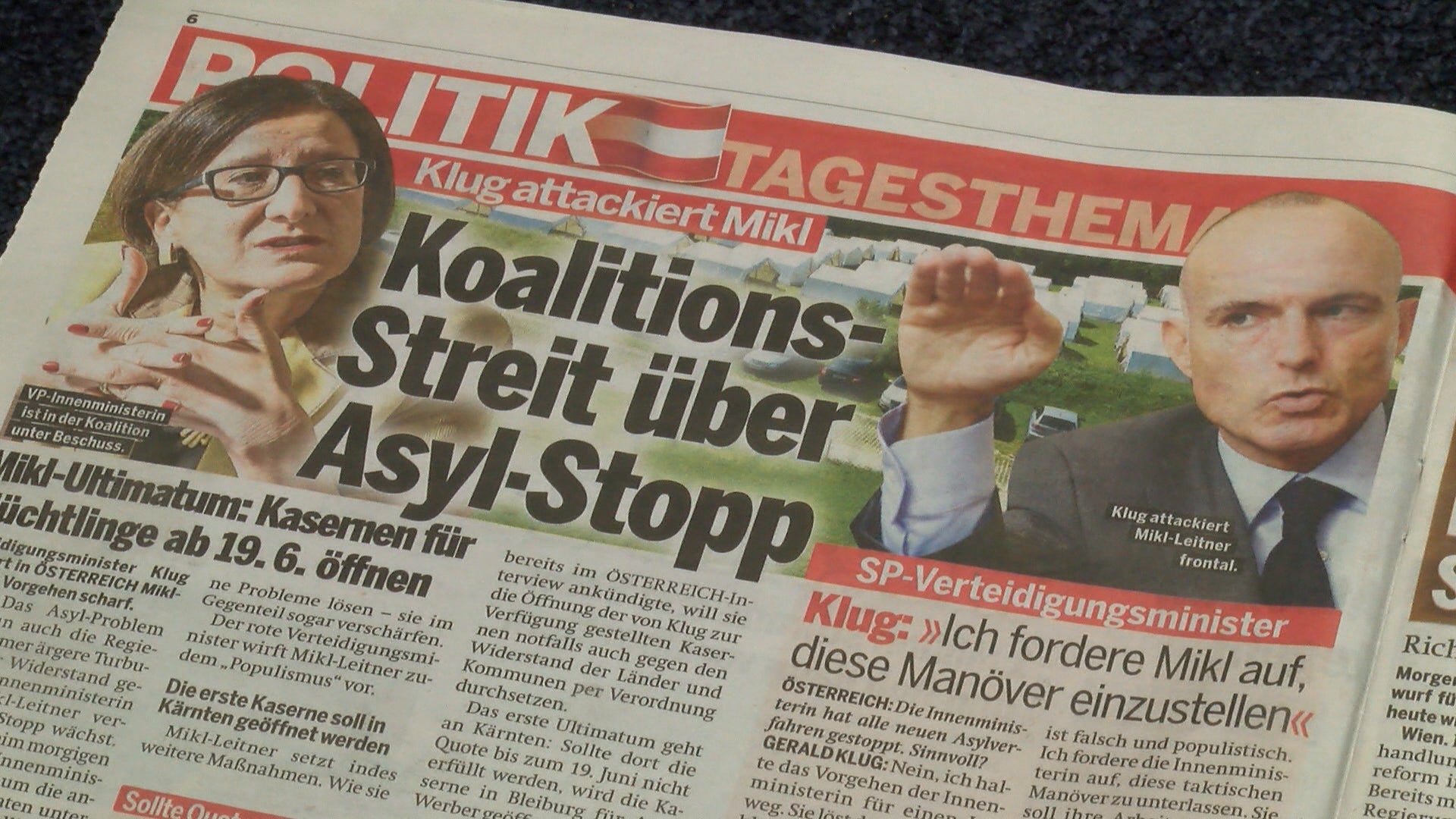 Verteidigungsminister Klug kritisiert in ÖSTERREICH Mikl-Leitners Vorgehen scharf.
