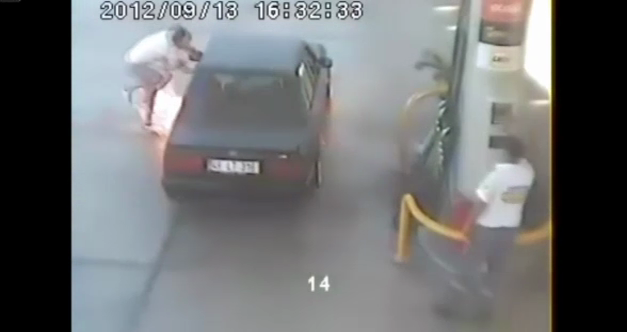Ein Mann unterhält sich mit den Insassen eines Autos durch das Fenster. Der Beifahrer, dessen Arm lässig aus dem Fenster hängt, äschert mehrmals seine Zigarette ab. Doch plötzlich geht der Boden in Flammen auf.