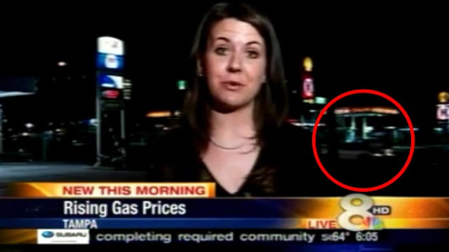 Reporterin Adrienne Pedersen ist mit einem langweiligen Bericht über steigende Benzinpreise beschäftigt, als es hinter ihr ordentlich kracht. Die Journalistin zuckt jedoch mit keiner Wimper.