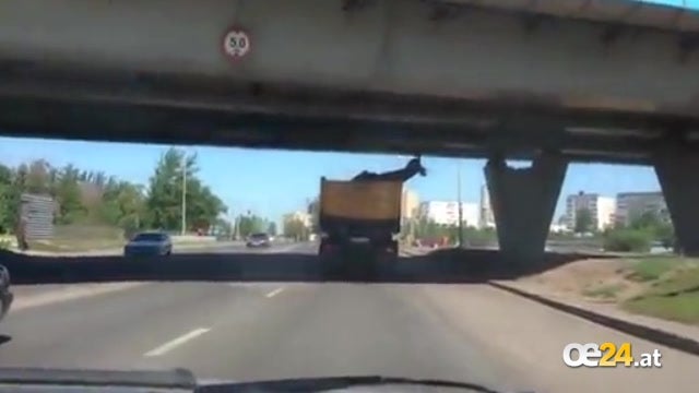Ganz gemütlich fährt dieser russische Lkw-Fahrer auf der Autobahn. Geladen hat er eine gigantische Tierstatue, die ganz offensichtlich nicht unter der kommenden Brücke hindurch passt. Ganz zum Vergnügen der Filmenden, jedoch nicht für den Fahrer.