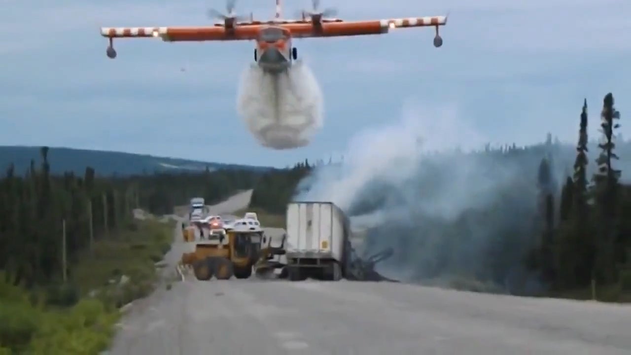 Der brennende Truck wird noch rechtzeitig von einem Löschflugzeug