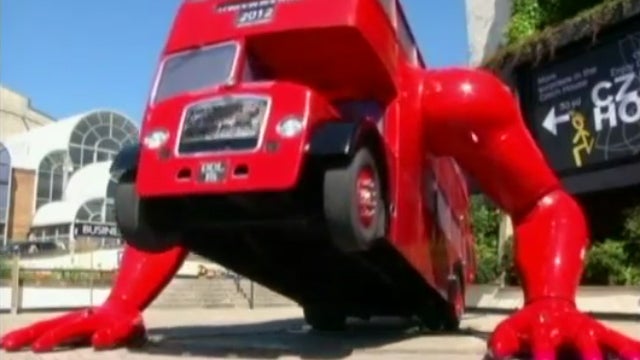 Der tschechische Künstler David Cerny hat aus einem Londoner Stadtbus eine Skulptur geschaffen, die imstande ist, Liegestützen zu absolvieren. Die gigantische Maschine mit dem Namen «London Boosted» steht ausserhalb der tschechischen Olympia-Unterkunft.