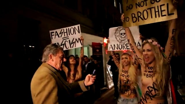 Mitglieder der ukrainischen Feministen-Gruppe Femen protestierten vor der Versace Show in Mailand gegen den Magerwahn und gegen die Modeindustrie.