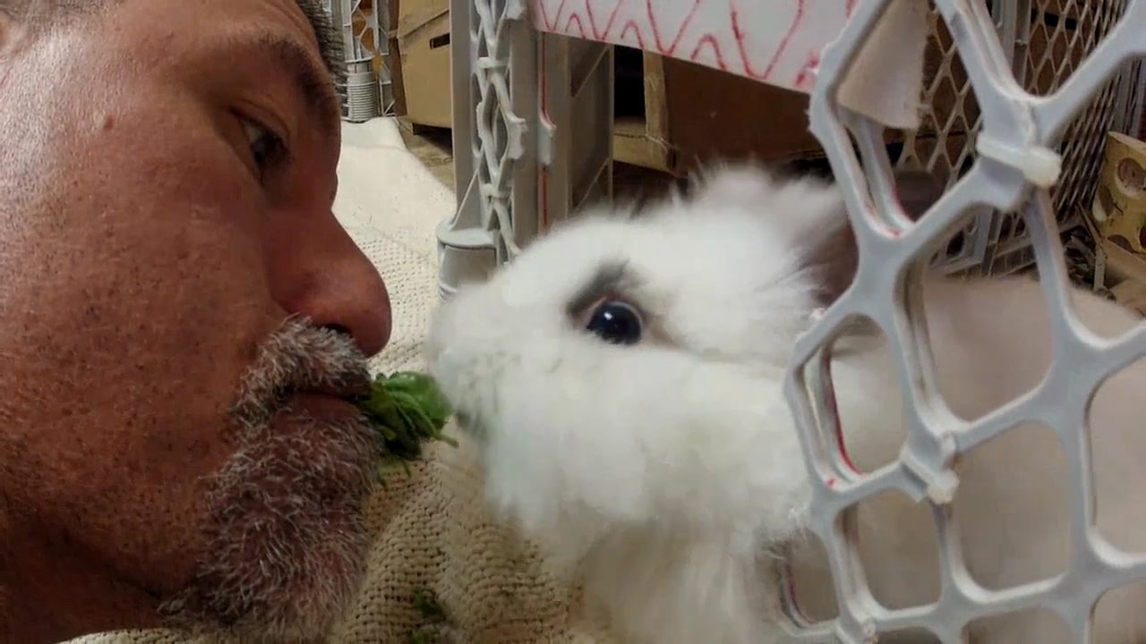 Hier wird ein Salat von seinem Besitzer an seinen Hasen weitergereicht.